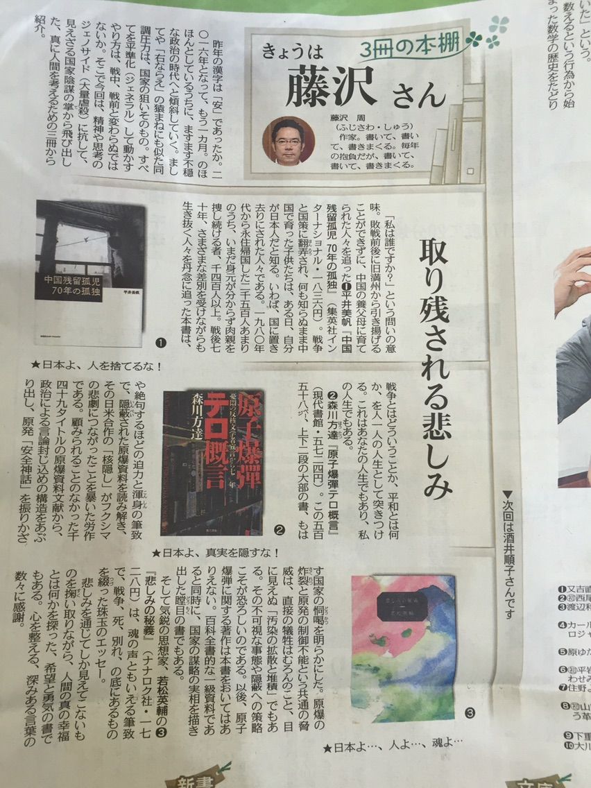 2月7日付 東京新聞「3冊の本棚」に藤沢周さんの書評掲載